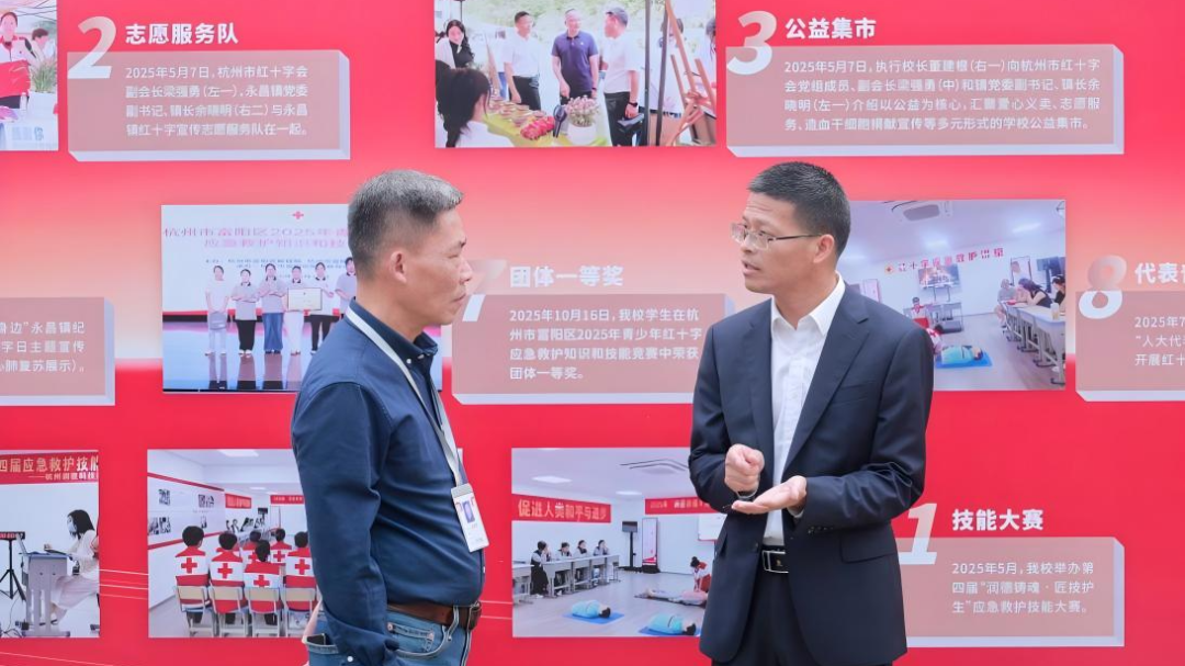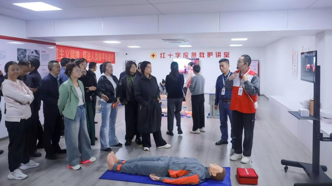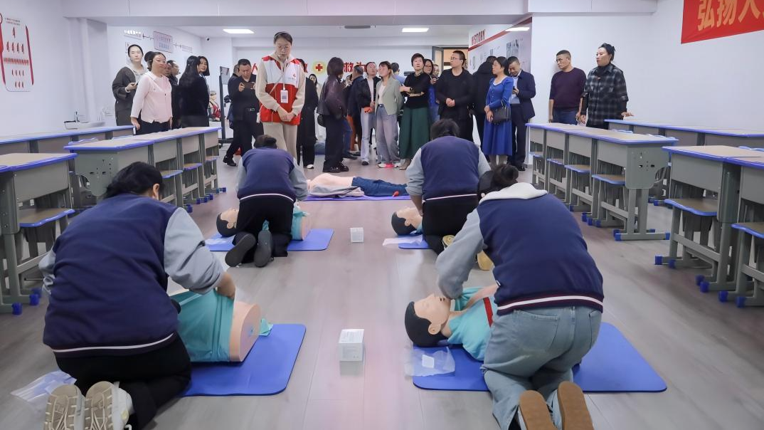 在应急救护训练室,来访领导观看了学生们正在进行的心肺复苏技术练习。训练室内配备的心肺复苏和气道异物梗阻模型设备引起了大家的浓厚兴趣,据介绍,这些培训设备由杭州市红十字会赠予,为学校应急救护训练提供了专业保障。一旁的学生们沉着冷静地演示着每一个步骤——判断意识、胸外按压、人工呼吸,操作熟练、手法专业,赢得了在场领导的点头赞许。