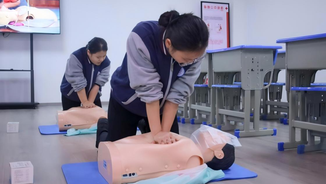 校园内,一群学生正围在模拟人前练习心肺复苏,专注的神情与专业的操作,引得来访者频频举起手机记录。