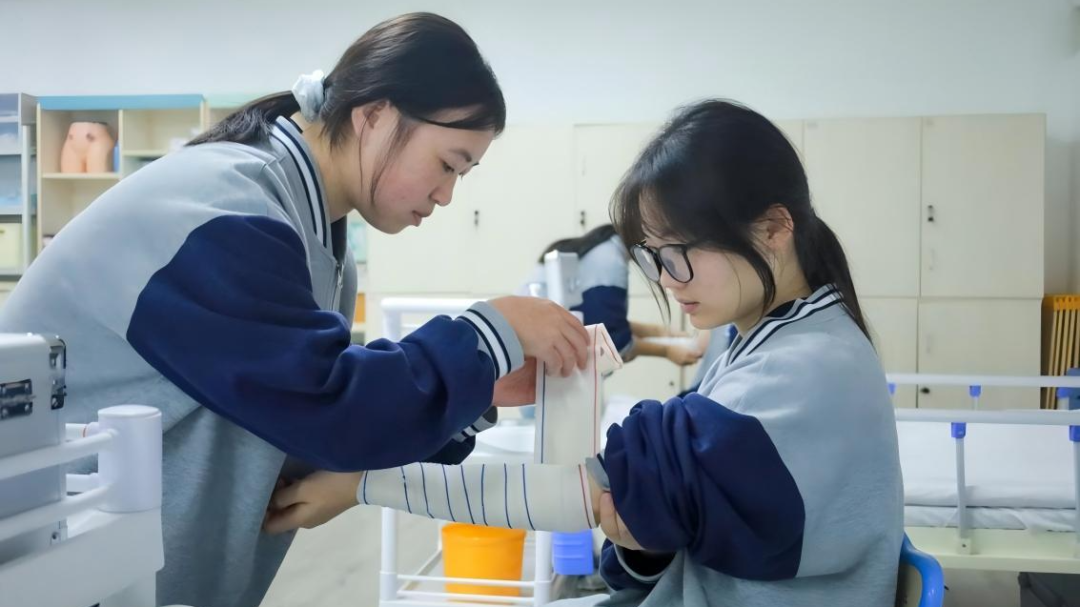 随后,领导们移步至护理实训室,这里的学生们正在练习止血包扎技术。不同部位的伤口包扎、多种包扎方法的灵活运用,学生们扎实的基本功和娴熟的操作技能,充分展示了学校应急救护训练的成效。这样的场景在学校已成常态。校方与红十字会长期合作,由应急救护师资担任培训导师,通过理论讲解和实践操作相结合的方式,有效提升了学生们的应急救护知识水平和实操能力。
